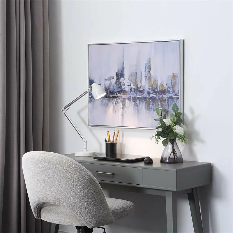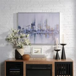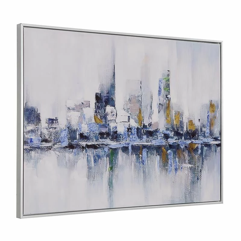 Liven up a bland wall or breathe new life into a tired space with this wrapped canvas painting print. It comes printed on wrapped canvas and Gold or Silver frame. It features a clean-lined horizontal silhouette that looks great above the console table in the entryway, or on the wall above the sofa in the living room. Boasting an abstract print of a reflecting City View in hues of blue, white, Gold and gray, this piece adds a pop of color to any wall. Plus, it comes with wall mounting hardware, saving you a trip to the store.