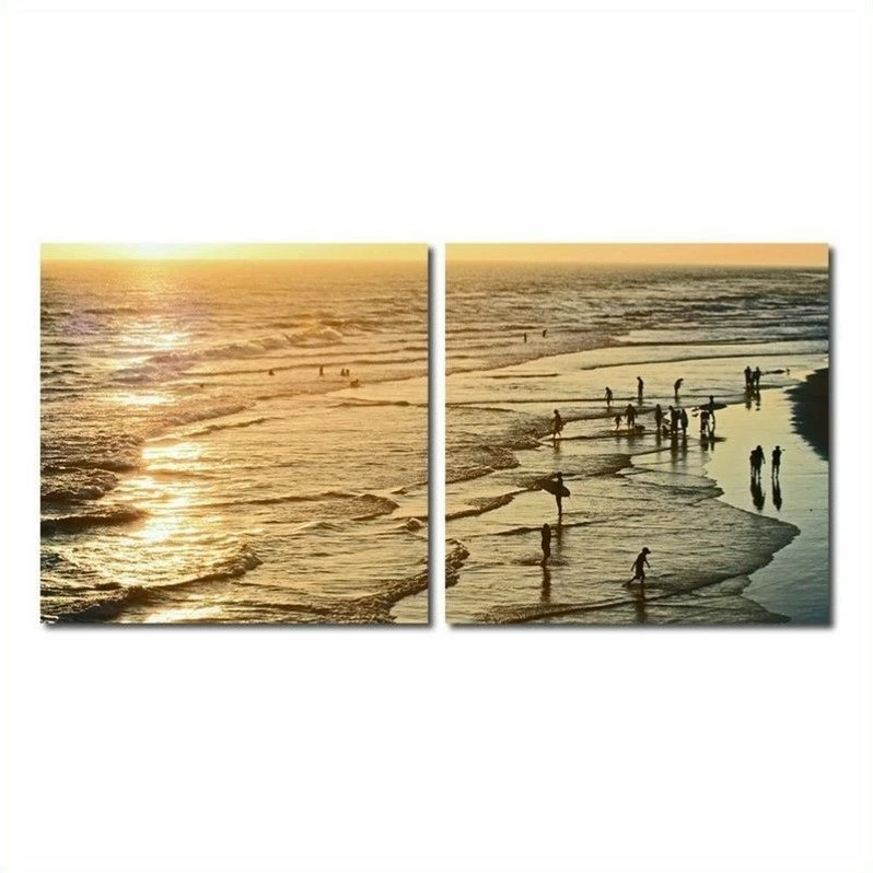 The sun peeks onto the beach for one last time, closing out yet another perfect day in paradise. Made in China with MDF wood frames, this two-piece modern wall art set features an image split in half and printed on two waterproof vinyl canvases. The Wading in the Waves Diptych is made in China and is fully assembled. Hardware for hanging on the wall of your choice is not supplied. To clean, wipe with a dry cloth.