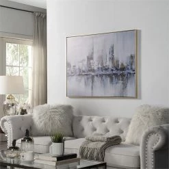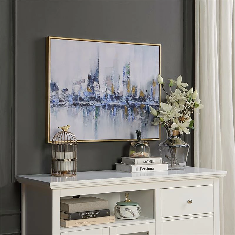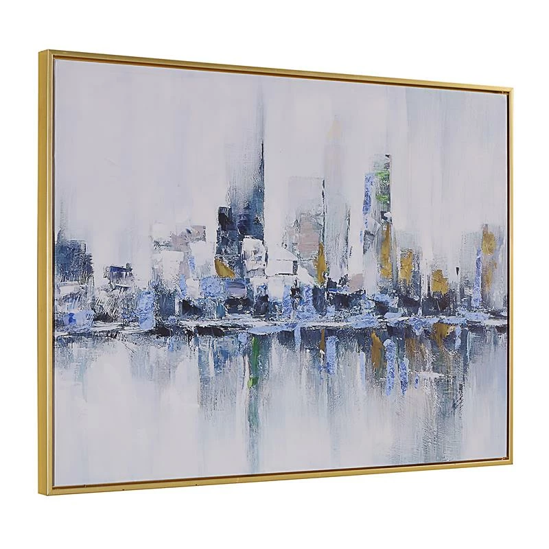 Liven up a bland wall or breathe new life into a tired space with this wrapped canvas painting print. It comes printed on wrapped canvas and Gold or Silver frame. It features a clean-lined horizontal silhouette that looks great above the console table in the entryway, or on the wall above the sofa in the living room. Boasting an abstract print of a reflecting City View in hues of blue, white, Gold and gray, this piece adds a pop of color to any wall. Plus, it comes with wall mounting hardware, saving you a trip to the store.