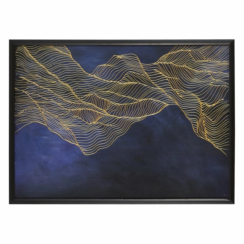 This unique piece is a fine example of contemporary oil-on-canvas abstract art. Accented with a smart dark hardwood frame, the lively contrast of the metallic gold wave lines plays beautifully with dark violet-blue background, making for a stunning piece of accent wall décor. Oil on canvas, no glass, 54” x 34”