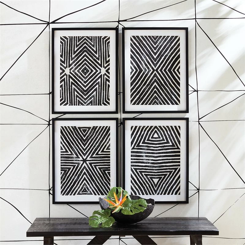 A monochromatic interpretation of the African kente cloth, these achromatic geometric prints are made in the way of wood block prints. With a variation in ink saturation, they are full of rich texture & pattern.