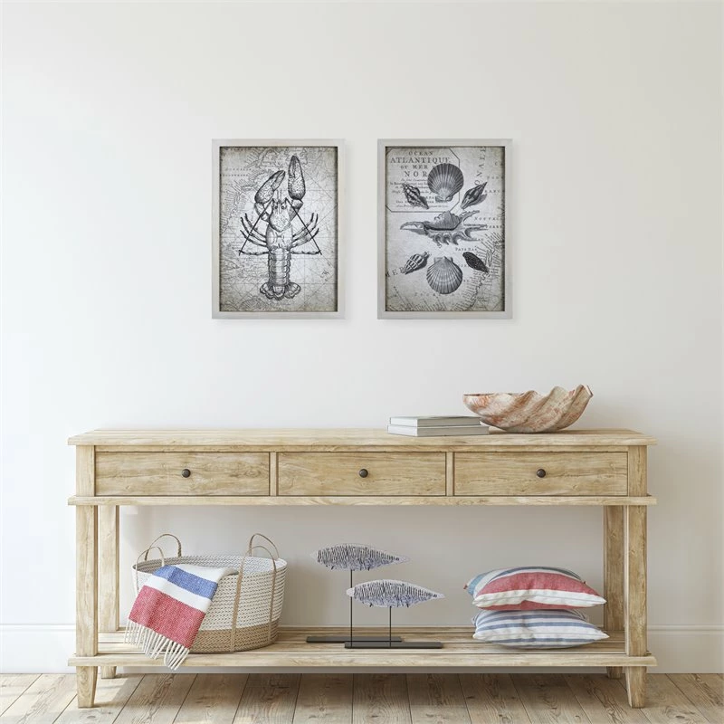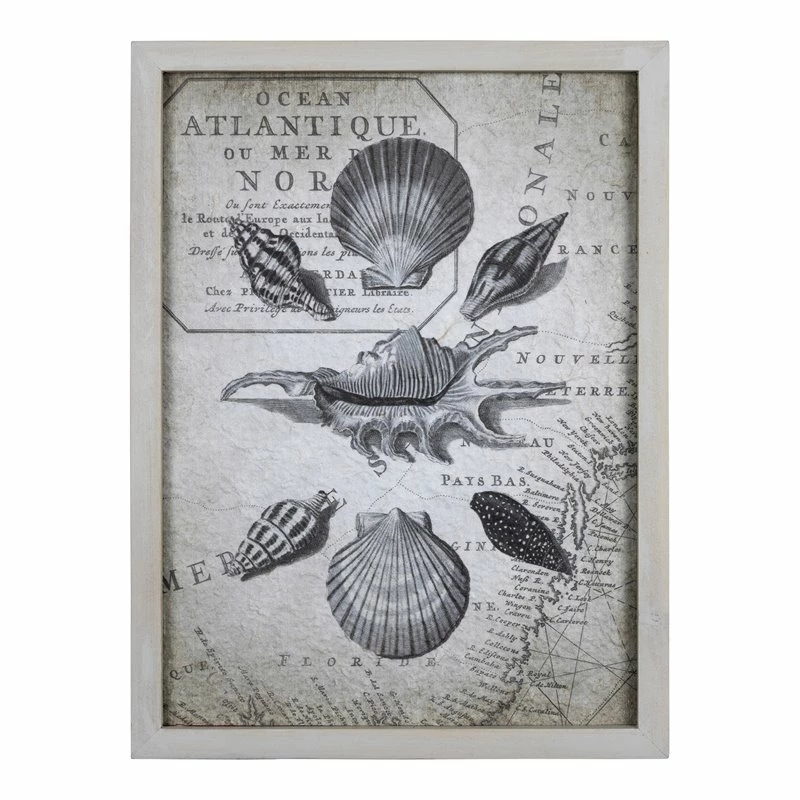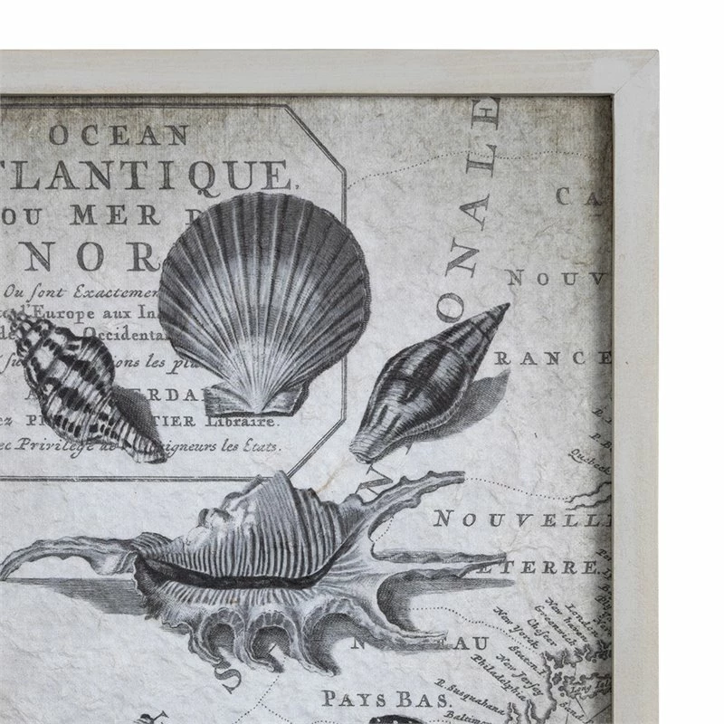 Double the appeal of your living space with this wall art piece. It features an image of shells and a map, showing off black, grey, and white colors. The piece is bordered by a wooden frame, which pairs well with an antique or vintage home design.