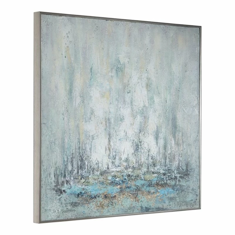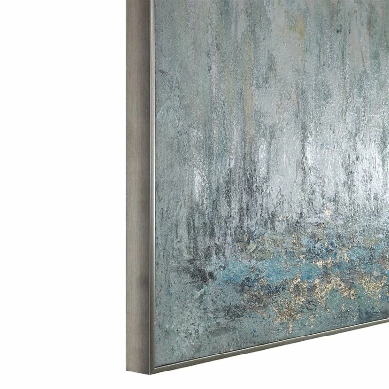 Hand painted on canvas, this abstract artwork exudes a modern, coastal feel. Silver and gold leaf, light yellow, cream, gray, blue, and sea foam green hues come together to form this heavily textured, gallery worthy piece of artwork. A petite, silver gallery frame surrounds the canvas. Due to the handcrafted nature of this artwork, each piece may have subtle differences. With the advanced product engineering and packaging reinforcement, uttermost maintains some of the lowest damage rates in the industry. Each product is designed, manufactured and packaged with shipping in mind.