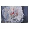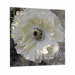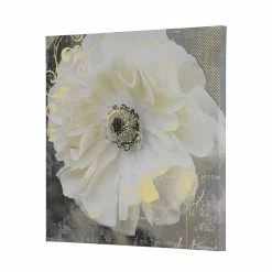 Large, Blooming, Ivory Flower Print On Linen In Soft Hues Of Taupe, Ivory And Grey Enhanced With Metallic Flourishes And Script.
