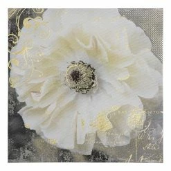 Large, Blooming, Ivory Flower Print On Linen In Soft Hues Of Taupe, Ivory And Grey Enhanced With Metallic Flourishes And Script.