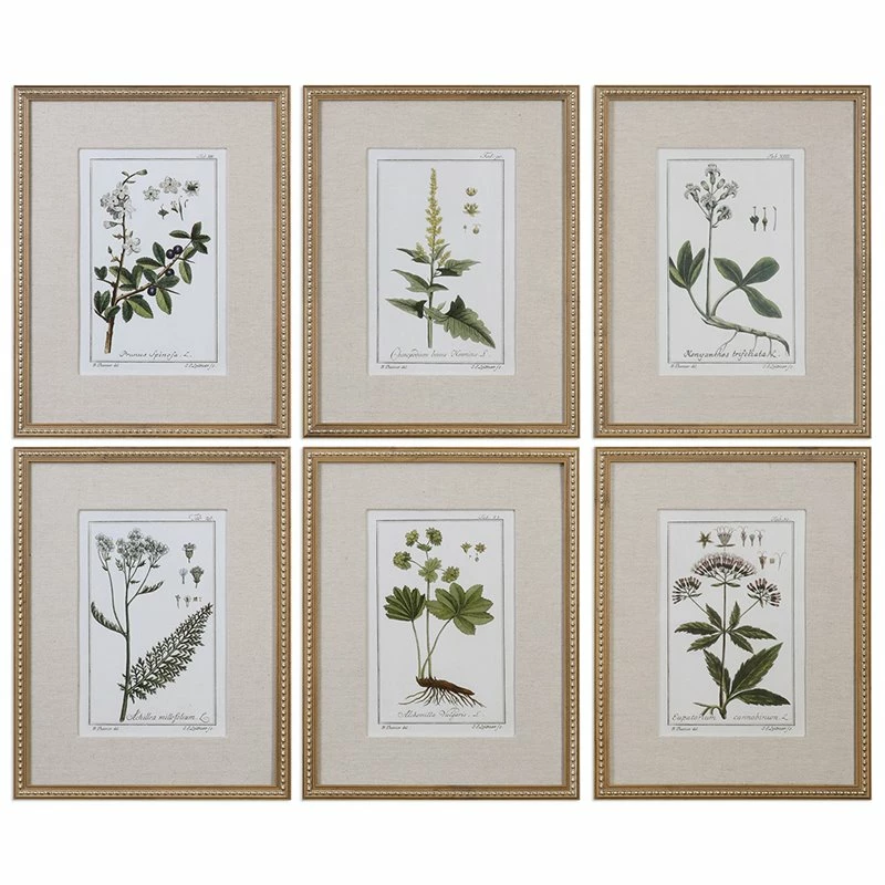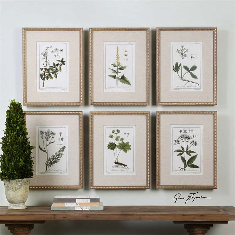 Traditional in style, these classic botanical prints bring a timeless elegance to a space. Each print is accented by a textured, linen mat. A distressed wooden frame finished in gold leaf and accented with gold beads completes each piece of artwork. Each print is placed under protective glass. With the advanced product engineering and packaging reinforcement, Uttermost maintains some of the lowest damage rates in the industry. Each product is designed, manufactured and packaged with shipping in mind.