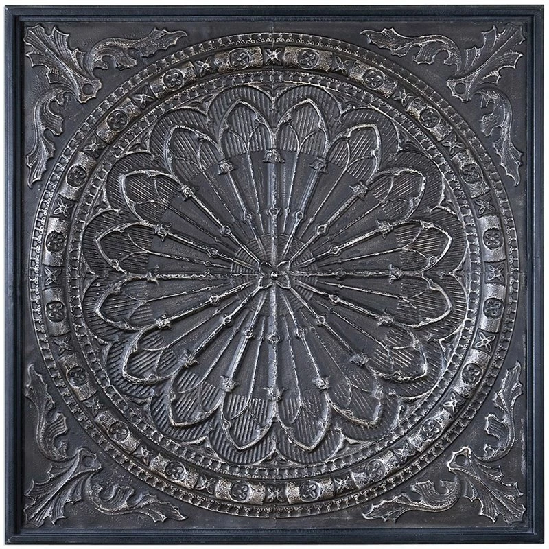 Ornate wall decor made of embossed iron finished with a lightly antiqued, chocolate brown glaze accented by a narrow, black crackled frame.