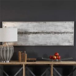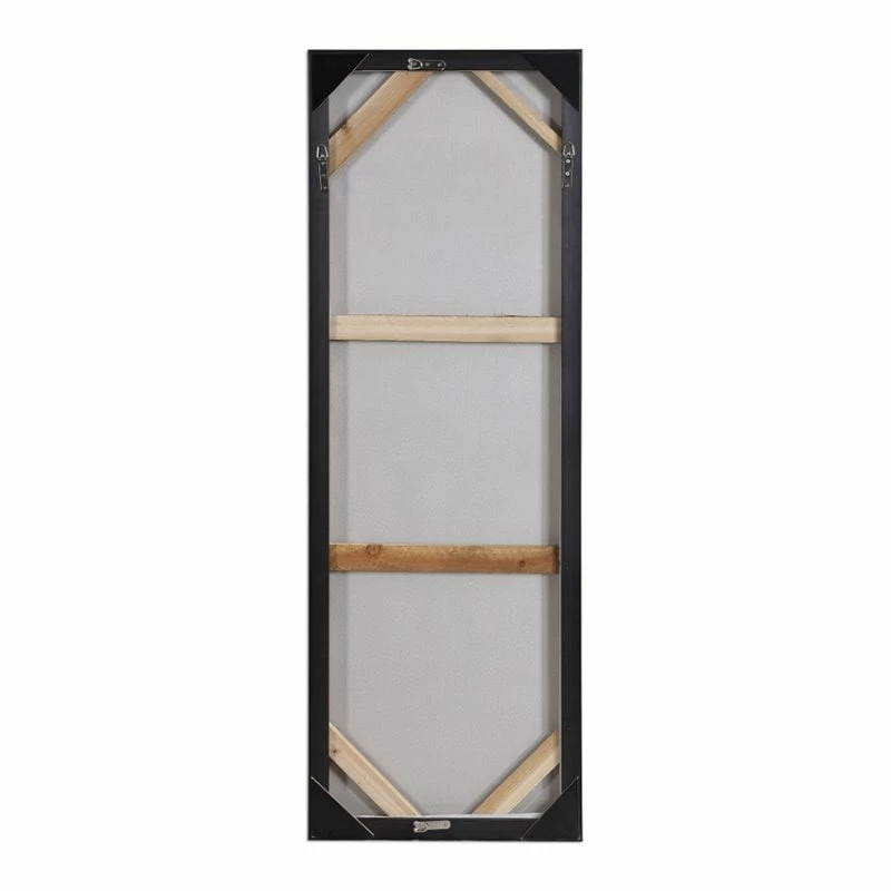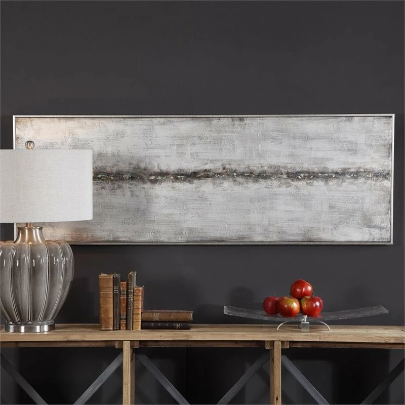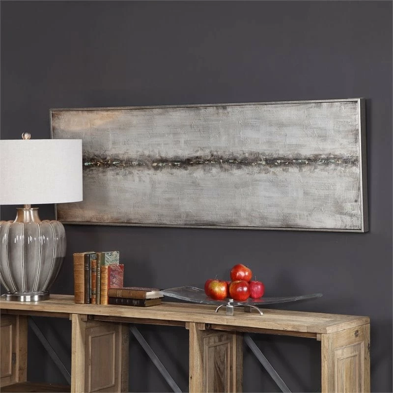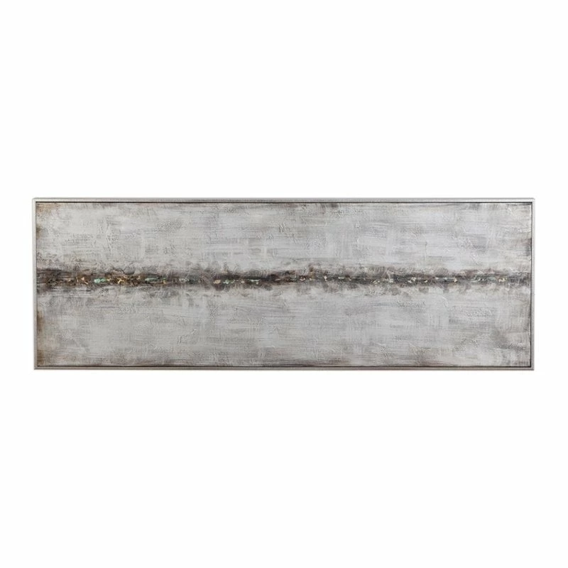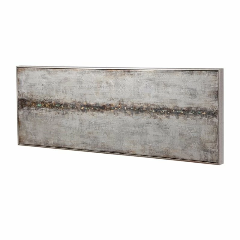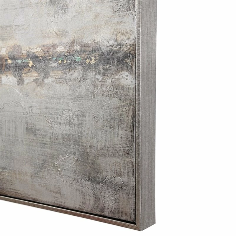 This modern, abstract artwork on canvas compliments any industrial design. A lightly textured silver background is accented with heavily concentrated gold leaf, sea foam green, black, and brown hues centered in the middle of this hand painted piece. An antiqued silver gallery frame surrounds the artwork. Due to the handcrafted nature of this artwork, each piece may have subtle differences. This piece may be hung horizontal or vertical. With the advanced product engineering and packaging reinforcement, uttermost maintains some of the lowest damage rates in the industry. Each product is designed, manufactured and packaged with shipping in mind.