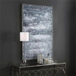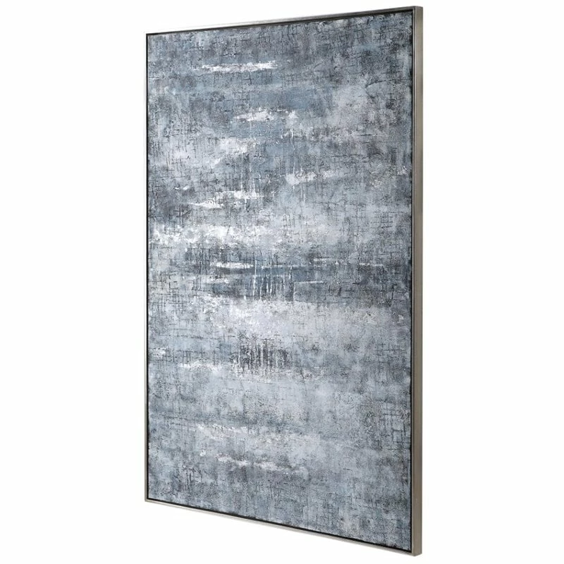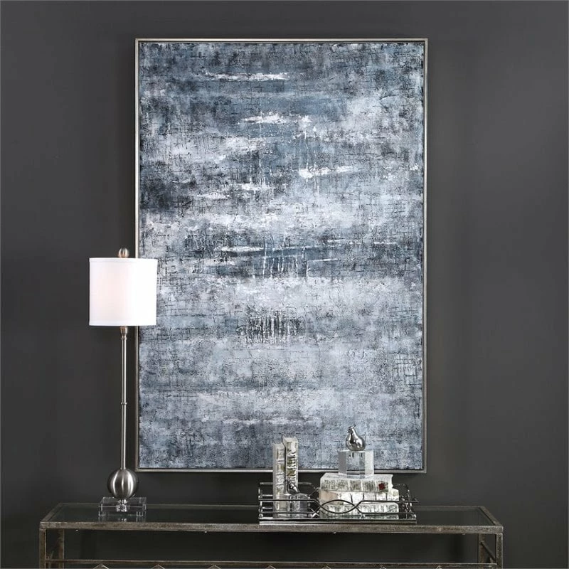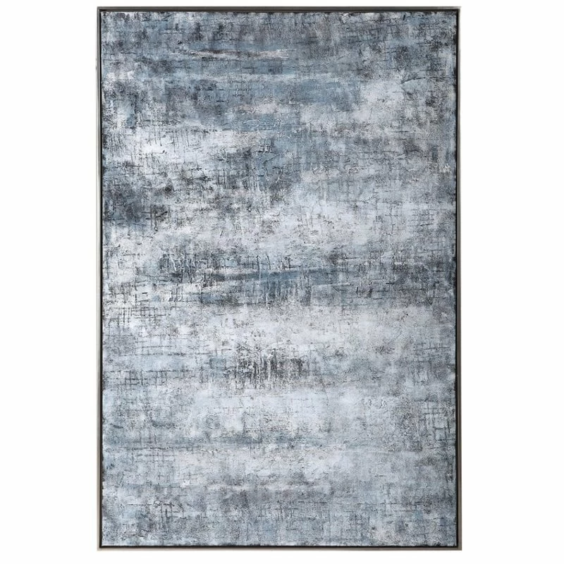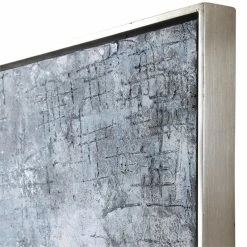 Cool-toned gray and icy blue shades make up this hand painted artwork. The textured abstract features steel blue, light gray, silver leaf, and white tones and an antique silver leaf gallery frame. Due to the handcrafted nature of this artwork, each piece may have subtle differences. This piece may be hung horizontal or vertical. With the advanced product engineering and packaging reinforcement, uttermost maintains some of the lowest damage rates in the industry. Each product is designed, manufactured and packaged with shipping in mind.