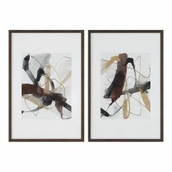 This Abstract Artwork Displays A Harmonious Blend Of Neutral Brushstrokes In Gray, Black, And Warm Chestnut Tones. Each Print Is Accented By A White Mat Under Glass With A Dark Walnut Finished Frame. Artwork By Jennifer Goldberger.