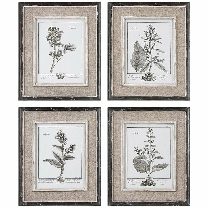 These botanical prints feature a contemporary take on an antique style. Each black and white print is surrounded by a light tan burlap mat. The outer frames have a heavily distressed black finish with a gray and taupe wash. The inner lips and fillets have a medium wood tone base with a heavily distressed white painted finish and a gray and taupe glaze. Each print is placed under protective glass.