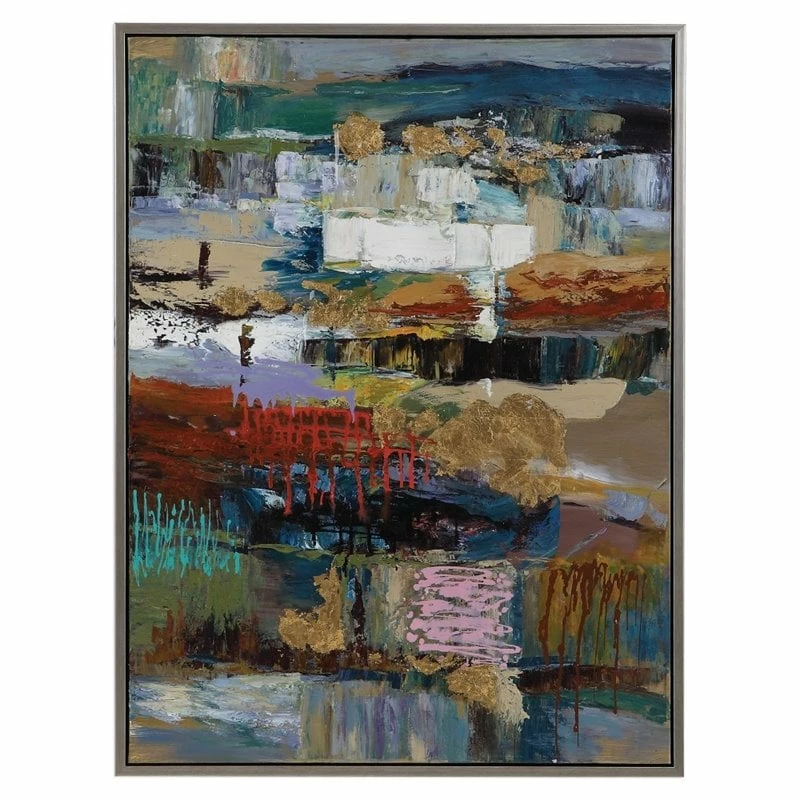 Bold, graphic brushstrokes make up this modern, hand painted abstract on canvas. The multi-colored composition showcases dynamic shades of blue, green, black, brown, and yellow with pops of salmon and lavender. An antiqued silver leaf gallery frame completes this artwork. Due to the handcrafted nature of this work, each piece may have subtle differences. This piece may be hung horizontal or vertical. With the advanced product engineering and packaging reinforcement, uttermost maintains some of the lowest damage rates in the industry. Each product is designed, manufactured and packaged with shipping in mind.