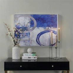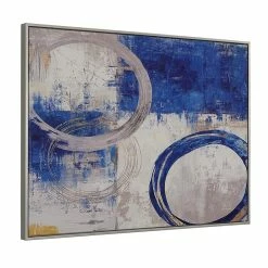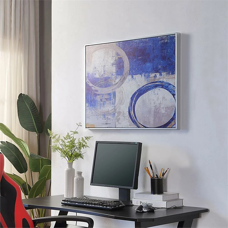 Liven up a bland wall or breathe new life into a tired space with this wrapped canvas painting print. It comes printed on wrapped canvas and Silver frame. It looks great above the console table in the entryway, or on the wall above the sofa in the living room. Boasting an abstract print of geometric abstract artwork with circular rings in shades of blue and silver, this piece adds a pop of color to any wall. Plus, it comes with wall mounting hardware, saving you a trip to the store.