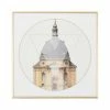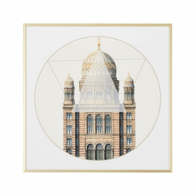 This architectural print is a fusion of old world and new world aesthetics. Featuring an austere cathedral accented and encircled with geometric patterns, this printed piece puts a symmetry to the classic and the modern. Accented with a gold aluminum frame and glass panels. Print, 24” x 24”