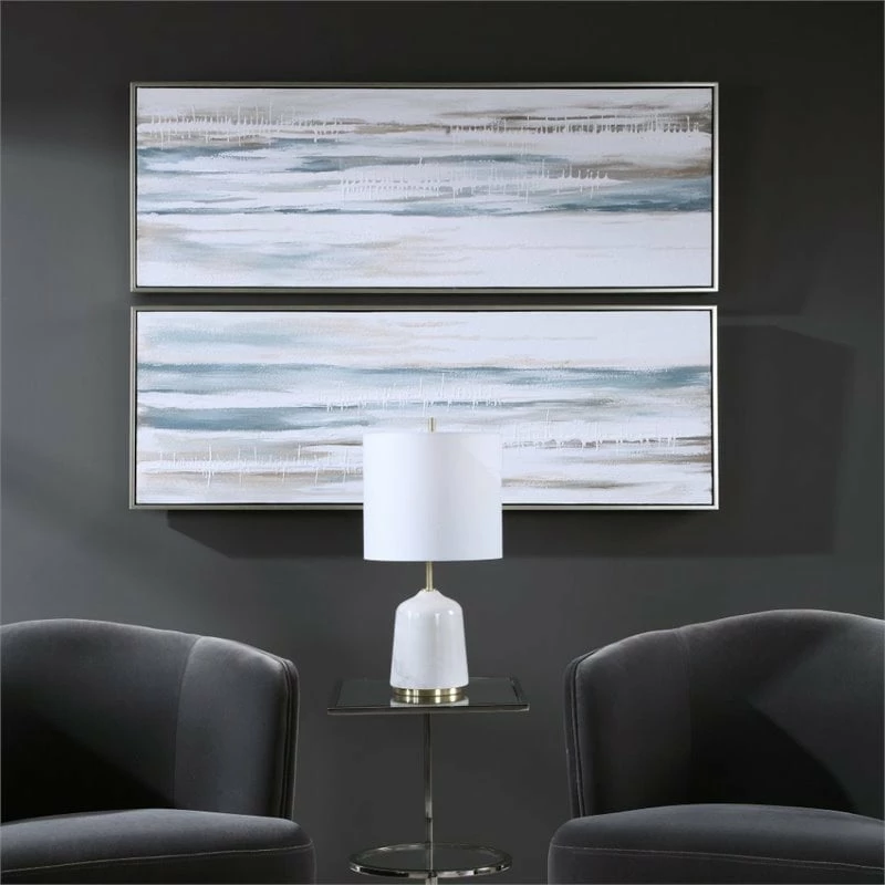 These hand painted abstract pieces showcase a soothing color palette with white, charcoal, taupe, and gray blue tones. Each is accented by a silver leaf gallery frame. Due to the handcrafted nature of this artwork, each piece may have subtle differences. With the advanced product engineering and packaging reinforcement, uttermost maintains some of the lowest damage rates in the industry. Each product is designed, manufactured and packaged with shipping in mind.
