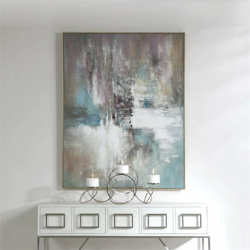 Hand painted artwork on canvas exhibits an array of color including lavender, aqua, white, and tan. A gold leaf gallery frame completes the abstract piece, which may be hung horizontal or vertical. With the advanced product engineering and packaging reinforcement, uttermost maintains some of the lowest damage rates in the industry. Each product is designed, manufactured and packaged with shipping in mind.